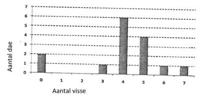'n Visserman skyf die aantal visse waat hy per dag vang neer. Die volgende balk-grafiek toon die resulate. Die gemiddeld en mediaan van die aantal visse gevang is: