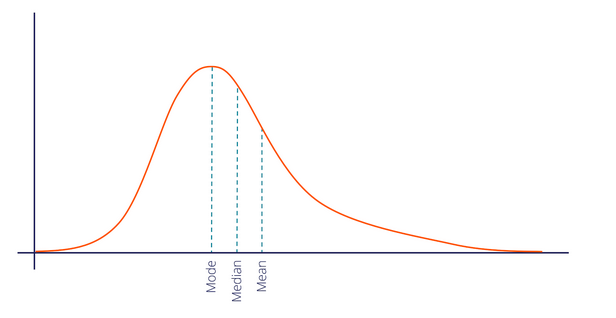 In Right Skewed Distribution the tail is longer in the _______Direction and the Mode ___ Median___ Mean.