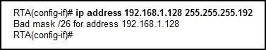 Refer to the exhibit. A network support technician has been asked to set an IP address on one of the FastEthernet interfaces on a new router. What is causing the interface to reject the address?