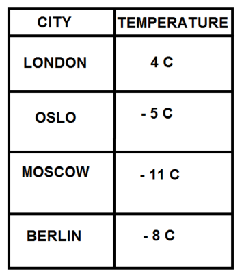 Outdoor temperatures were taken in the four cities, shown in the chart. How many degrees colder was Moscow than London.