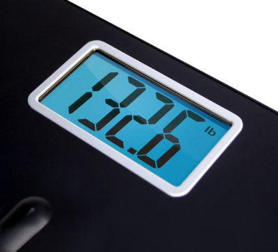 Ranjit stands on the scales to weigh himself. He knows that 2.2 pounds = 1 kilogram. How much does he weigh to the nearest kilogram.