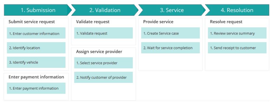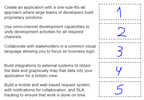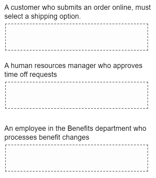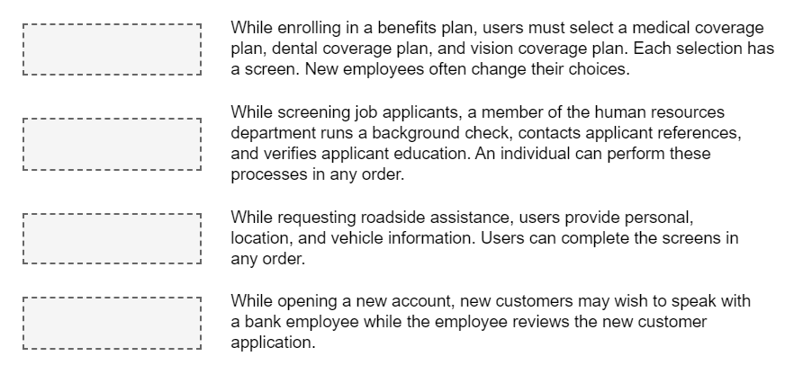 Consider a Postal address verification microjourney. In this microjourney, customers enter their mailing address in a web portal, and Pega Platform verifies whether the mailing address is valid by using the Postal Service database. Drag the following items to the appropriate drop zone.