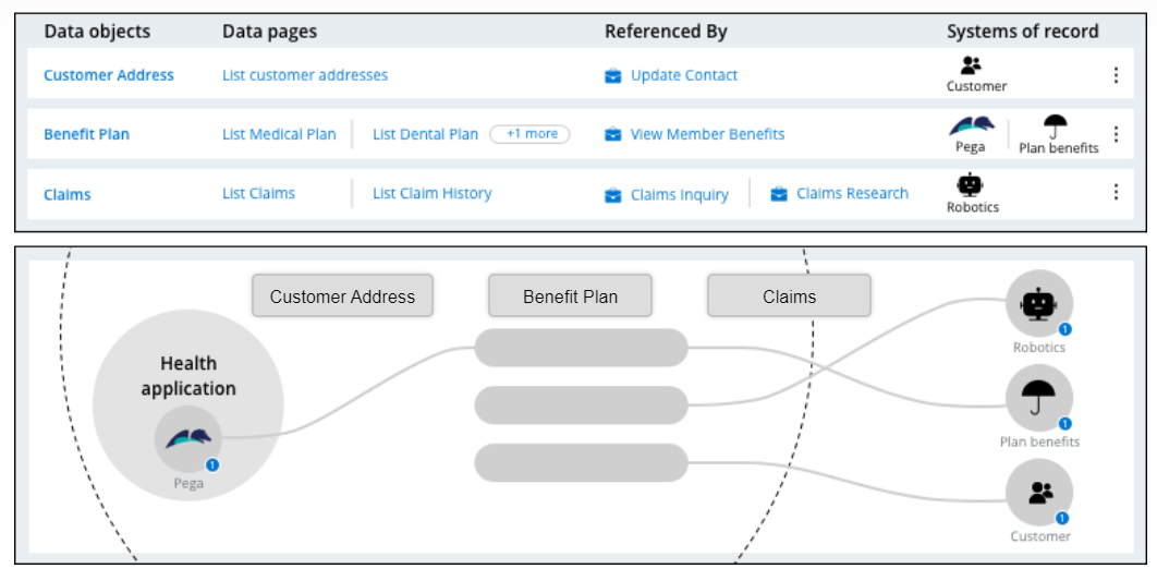 To gain more insight into how the data objects, data pages, case types, and systems of record relate to one another in your application, refer to the Visual Data Model.