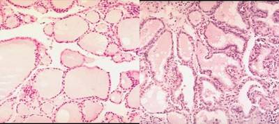 The thyroid pictured on the right has undergone hyperplasia and hypertrophy.