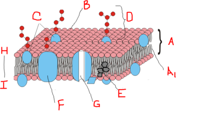 In the diagram below, which letter points to a structure that helps with cell attachment, signaling, and recognition of substances?