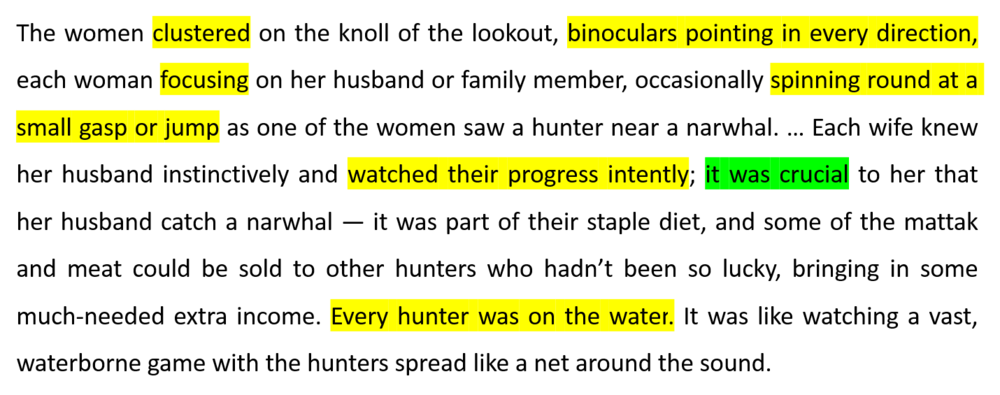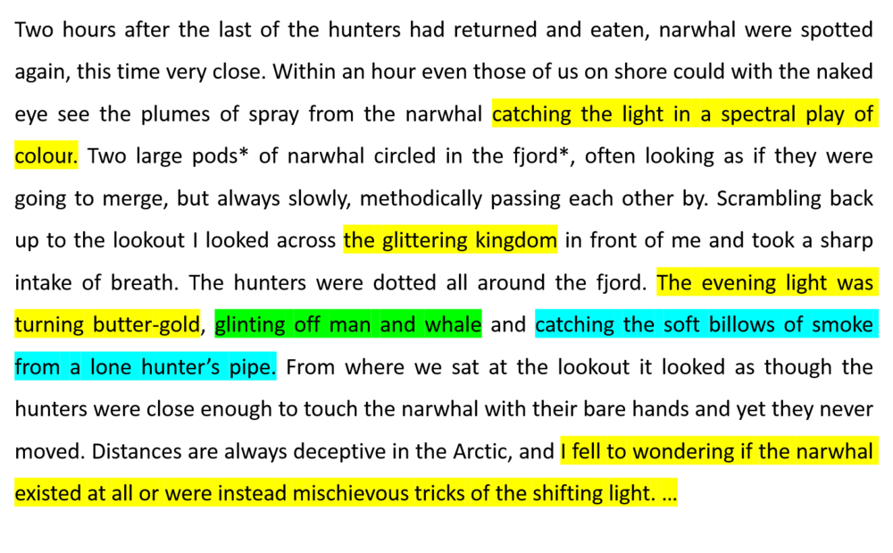In the opening paragraph, Herbert establishes a mystical, other-worldly atmosphere as she sets the scene for the Inughuit narwhal hunt.