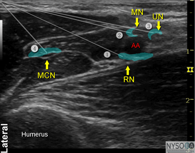 Patient having an operation of a lacerated index finger under regional anaesthesia. Which combination of nerves blocked on this axillary view will provide adequate cover?