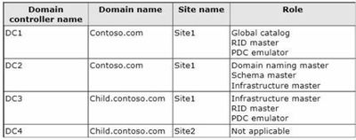 The forest contains two domains named contoso.com and child.contoso.com and two sites named Site1 and Site2. The domains and the sites are configured as shown in the table.