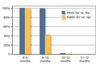 What does this chart indicate about infants? (The infants in this study were from English speaking nations. The title for this chart is "Diminishing Sensitivity to Foreign Language Contrasts as True Speech Begins")
