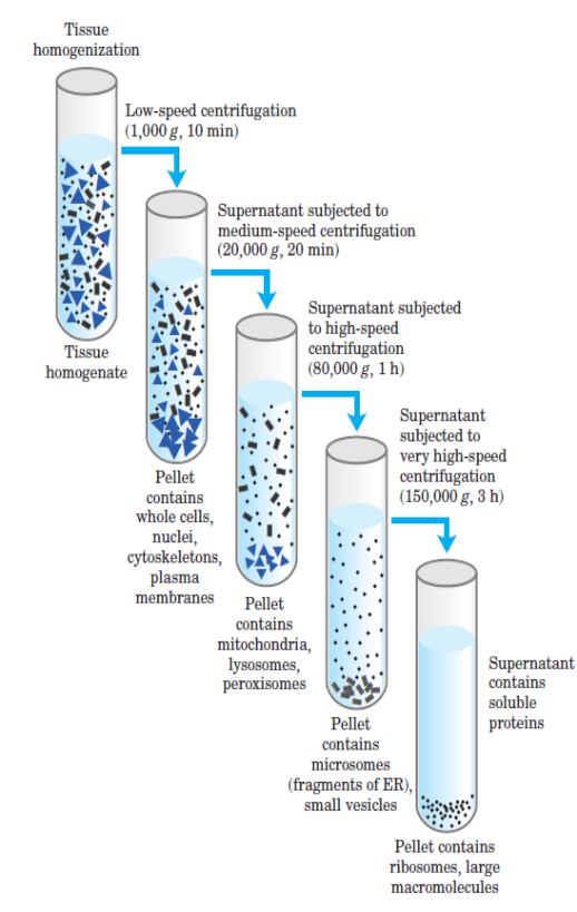 A tissue sample is homogenized to make a homogenate. The tissue sample is crushed in a blender with a buffer then placed in tubes. The tubes are placed in the centrifuge for a certain time at a certain speed. When centrifugation is over, the supernatents can be placed into new tubes and centrifuged again, while the pellet at the bottom can be examined. The process may be repeated a third time.