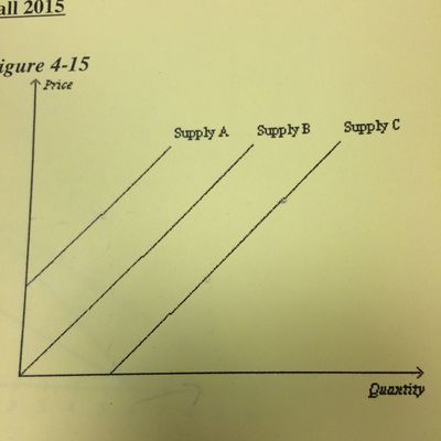 Which of the following would cause the supply curve to shift from Supply A to Supply C in the market for beach towels?
