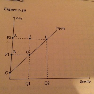 Which area represents the INCREASE in producer surplus when the price rises from P1 to P2?