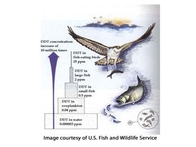 Because toxins are stored in the fatty tissues of animals and are not passed out of their body. This multiplies as one moves higher up the food chain.
