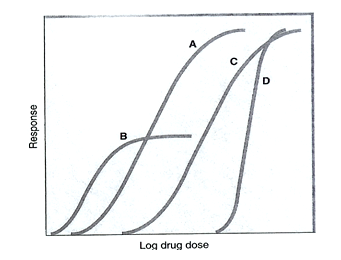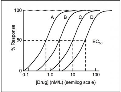 A laboratory is conducting a study to assess the safety, efficacy, and potency of a group of drugs before allowing the agents to proceed to clinical trials. The figure shows the dose-response curves for four different drugs from the same class of medications (Drugs A, B, C, & D). Which of the following is true regarding these medications?
