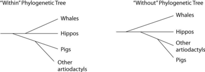 Figure 26.2 contrasts the "Within the artiodactyls" origin of the whale lineage with the "Without the artiodactyls" origin of the whale lineage