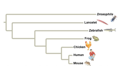 The relative lengths of the frog and the mouse branches in the phylogenetic tree in the figure given indicate that...