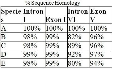 The next question refer to the following table, which compares the % sequence homology of four different parts (two introns and two exons) of a gene that is found in five different eukaryotic species. Each part is numbered to indicate its distance from the promoter (e.g., Intron I is the one closest to the promoter). The data reported for species A were obtained by comparing DNA from one member of species A to another member of species A.