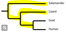 Salamanders are a sister group to the group containing lizards, goats, and humans.