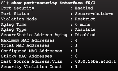 Refer to the exhibit. The network administrator is configuring the port security feature on switch SWC. The administrator issued the command show port-security interface fa 0/2 to verify the configuration. What can be concluded from the output that is shown? (Choose three.)