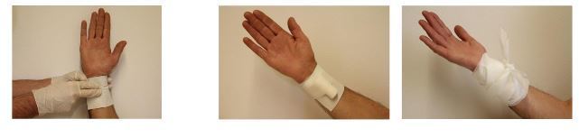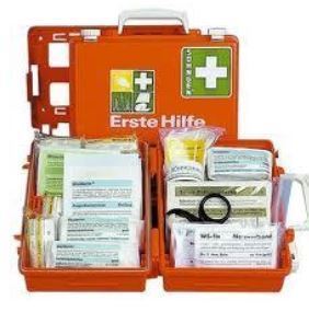 Welche Hilfsmittel werden für einen Druckverband benötigt und entnimm diese dem Erste Hilfe Koffer und lege sie auf den Tisch