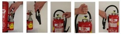 Wie wird ein Handfeuerlöscher in Betrieb gesetzt und zeige es vor!