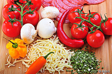 Auf der Pizza hat es viele Sachen: Pilze, Tomaten, Auberginen, Zwiebeln und vieles mehr. Das sind die Pizza - [blank_start]Zutaten[blank_end].