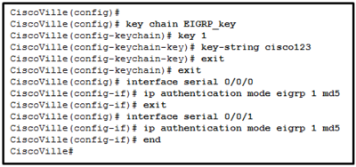 Refer to the exhibit. Router CiscoVille has been partially configured for EIGRP authentication. What is missing that would allow successful authentication between EIGRP neighbors?