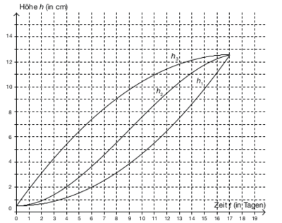 Die Höhe h (in cm) von drei verschiedenen Pflanzen in Abhängigkeit von der Zeit t (in Tagen)wurde über einen längeren Zeitraum beobachtet und mittels geeigneter Funktionen h 1 (für Pflanze 1), h 2 (für Pflanze 2) und h 3 (für Pflanze 3) modelliert. Die nachstehende Abbildung zeigt die Graphen der drei Funktionen h 1 , h 2 und h 3 .