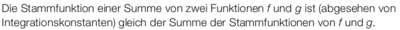 „Besitzt eine Funktion f eine Stammfunktion, so besitzt sie sogar unendlich viele. Ist nämlich F eine Stammfunktion von f, so ist für jede beliebige reelle Zahl c auch die durch G(x) = F(x) + c definierte Funktion G eine Stammfunktion von f.“