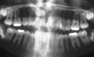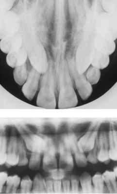 You may wish to take some [blank_start]radiographs[blank_end] to determine the cause of the unerupted teeth. The [blank_start]parallax[blank_end] technique can locate the position of impacted teeth.