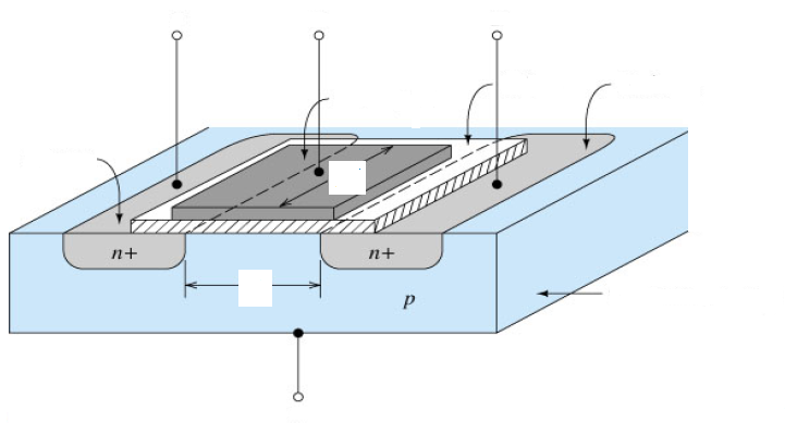 for N-channel enhancement-mode MOSFET (commonly known as nMOS transistor), longer the L (length), [blank_start]higher[blank_end] the R (resistance). Therefore, the current flowing from Drain to Source is [blank_start]lower[blank_end].