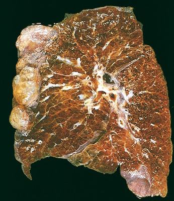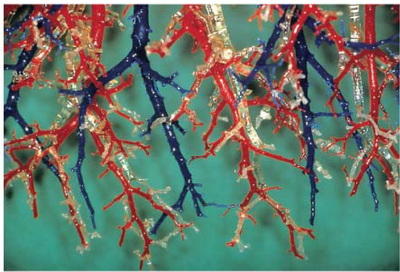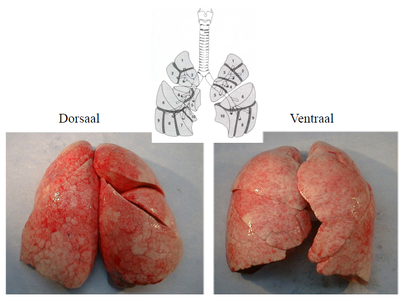 De rechter long bestaat uit [blank_start]3[blank_end] kwabben, de linker uit [blank_start]twee[blank_end] kwabben. De bronchi (met slijmkliertjes, glad spierweefsel en kraakbeen) vertakken zich in [blank_start]bronchioli[blank_end] (zonder slijmkliertjes en kraakbeen) en uiteindelijk tot alveoli. Als de patholoog met z'n dikke vingers het glimmende oppervlak op de foto aanraakt, zit hij aan de pleura [blank_start]visceralis[blank_end].