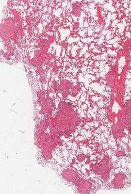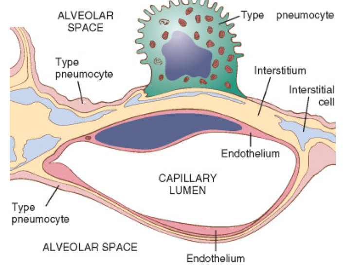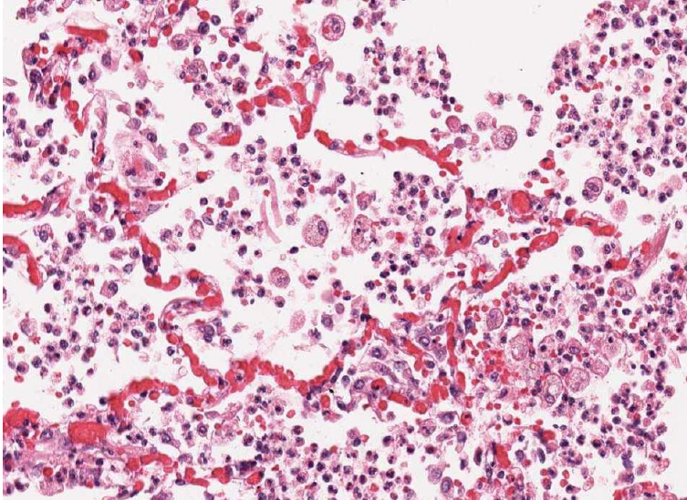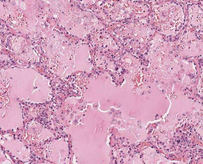 De alveoli zijn gevuld met roze [blank_start]exudaat[blank_end] (= eiwitrijk vocht) en plaatselijk wat fibrine draden. In een later stadium ontstaat hieruit zogenaamde [blank_start]hyliene[blank_end] membranen. Een belangrijke oorzaak van een ARDS long is: [blank_start]infectie[blank_end].