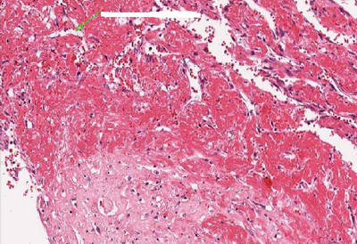 Hier ziet u een detail van de thrombo-embolus. Is er reeds sprake van organisatie?