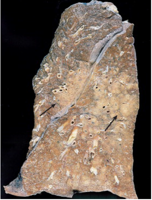 Dit explantaat toont wijde luchthoudende holten welke subpleuraal gelegen zijn, zogenaamde [blank_start]bullae[blank_end].
