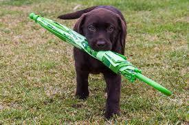 The dog [blank_start]took[blank_end] the umbrella in its mouth and brought it to his master.