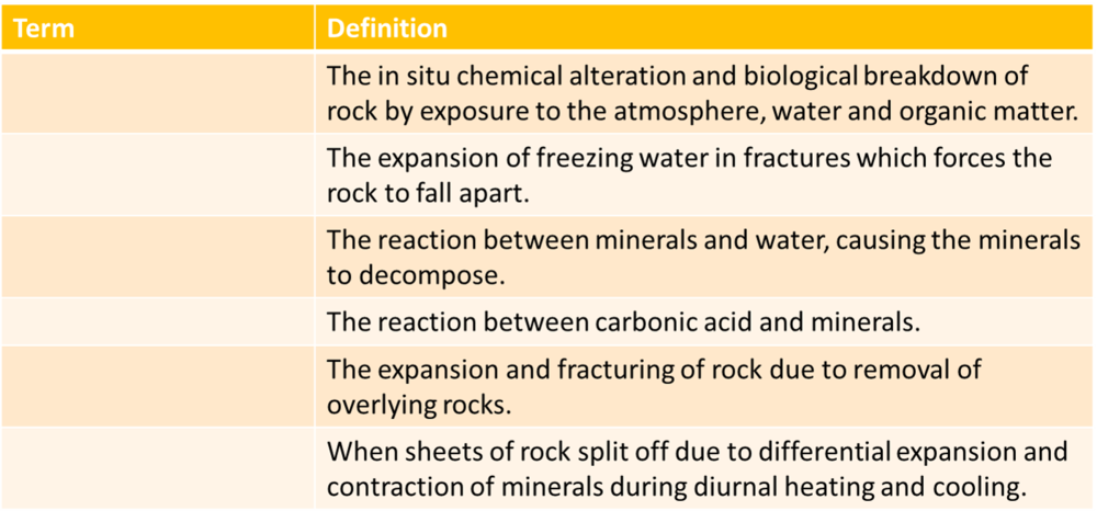 - Different [blank_start]minerals[blank_end] expand and contract by different [blank_start]amounts[blank_end] during heating and cooling, causing the rock to [blank_start]disintegrate[blank_end].