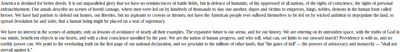 "America is destined for better deeds. It is our unparalleled glory that we have no reminiscences of battle fields, but in defence of humanity, of the oppressed of all nations, of the rights of conscience, the rights of personal enfranchisement. Our annals describe no scenes of horrid carnage, where men were led on by hundreds of thousands to slay one another, dupes and victims to emperors, kings, nobles, demons in the human form called heroes. We have had patriots to defend our homes, our liberties, but no aspirants to crowns or thrones; nor have the American people ever suffered themselves to be led on by wicked ambition to depopulate the land, to spread desolation far and wide, that a human being might be placed on a seat of supremacy.