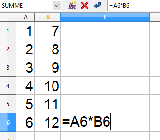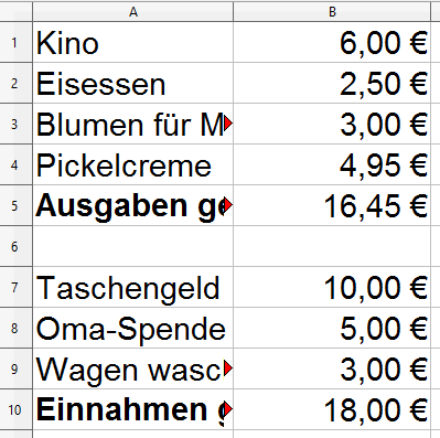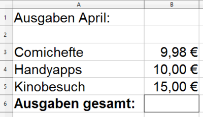 In der Zelle B6 soll mithilfe von Zellbezügen die Formel für die gesamten Ausgaben angegeben werden. Die korrekte Formel lautet: [blank_start]=B3+B4+B5[blank_end]