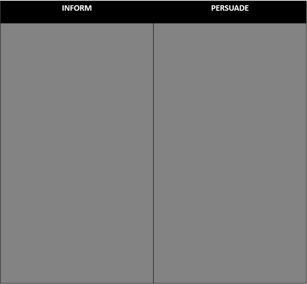 The purpose of this letter is to inform and persuade. Choose the most appropriate conventions to use for this task by dragging and dropping them into either the 'INFORM' column or the 'PERSUADE' column.
