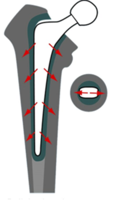 Bone cement uses adhesive properties to bond together bone and a hip implant