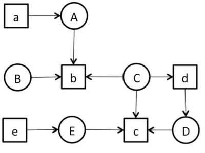 Das folgende Diagramm zeigt einen Betriebsmittel-Graph mit den Prozessen A-E und den Ressourcen a-e. Welche der folgenden Aussagen zum abgebildeten Betriebsmittel-Graph sind korrekt?
