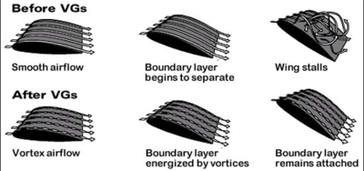 Airflow separation over the wing can be delayed by using vortex generators: