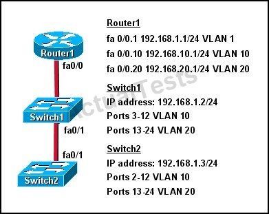 • Port FastEthernet 0/1 needs to be configured as an access link on both switches.