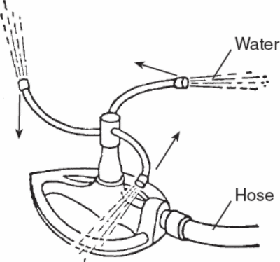 Sprinklers spray out water, causing the sprinkler to move in the opposite direction in the shape of a circle.