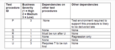 The above table shows 6 test procedures (P to U) that must now be entered into a test execution schedule. Business severity is regarded as the most important element in determining the sequence of the test procedures, but other dependencies must also be taken into consideration. Regression testing can only be run once all other tests have completed.
