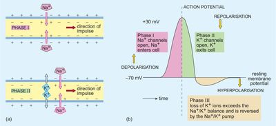 The loss of K+ together with the [blank_start]closure[blank_end] of Na+ channels, causes the potential difference across the membrane to become more negative inside the axon than its initial polarised value - this third phase is called [blank_start]hyperpolarisation[blank_end]. The situation is reversed by the action of [blank_start]Na+/K+[blank_end] pumps which gradually return the membrane potential to its resting potential - the time when the neuron is in this state is named the [blank_start]refractory[blank_end] period.