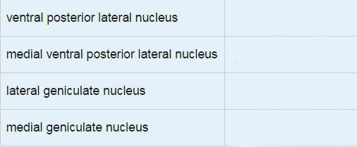 For each of the thalamic nuclei below select the appropriate type of sensory information processed from the drop down menu.