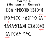 As runas húngaras eram escritas preferencialmente da direita para esquerda, mas também podia se alternar a ordem (primeira linha da direita para esquerda, segunda linha da esquerda para direita, e assim por diante) . Outros sistemas de escrita também utilizam essa ordem (da direita para a esquerda), como o hebraico e o árabe. O sistema de escrita que NÃO utiliza a mesma ordem utilizada pelas runas húngara é: