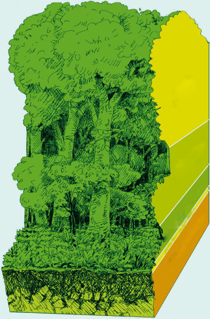 Das oberste Stockwerk, die [blank_start]Baumschicht[blank_end], wird aus den Baumkronen älterer Bäume gebildet.
